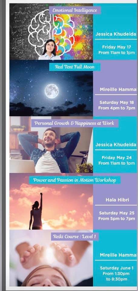 - the Art of self compassion & self care, 3 may -pink & blue brain ,10 May emotional intelligence,17 may - personal growth & happiness at work,24